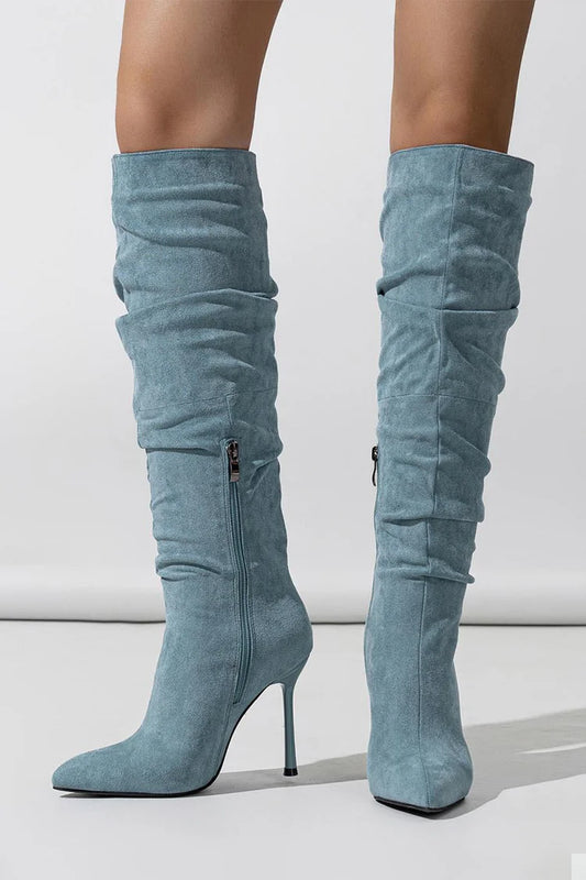 Stivali alti al ginocchio con tacco a spillo, punta arricciata, cerniera, tinta unita