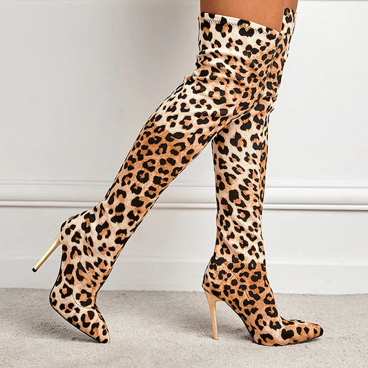 Stivali sopra il ginocchio con tacco a spillo e punta a punta con stampa leopardata