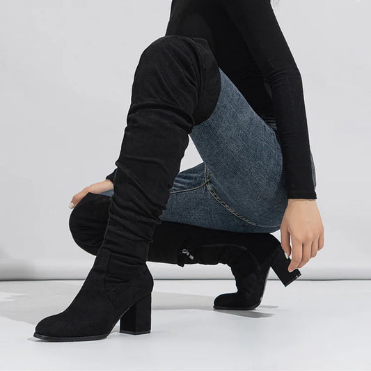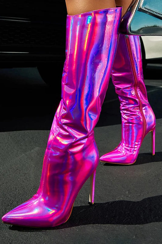 Stivali sopra il ginocchio con tacco a spillo, punta affilata e cerniera laterale