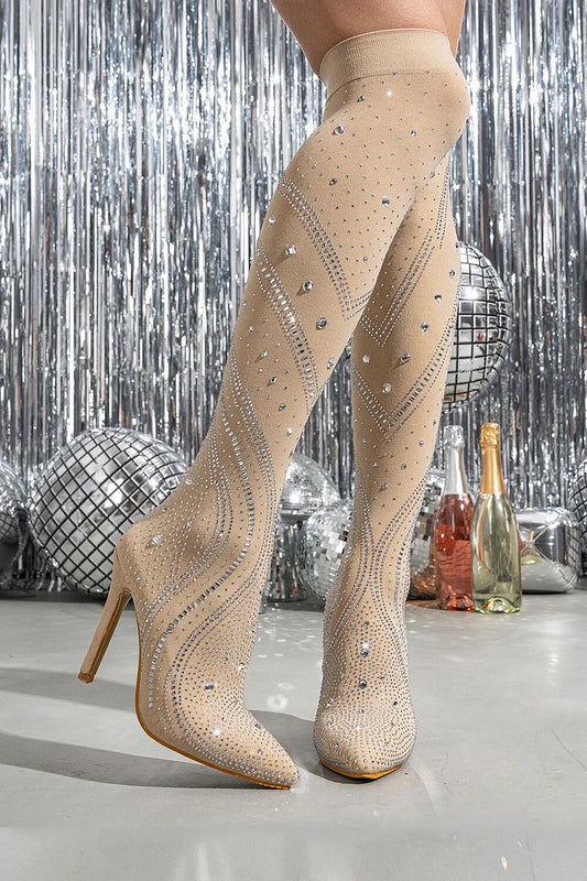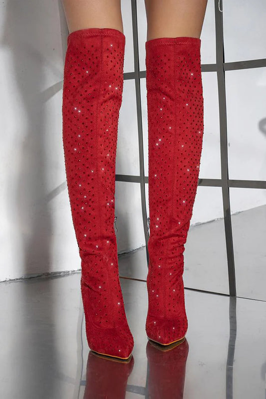 Stivali sopra il ginocchio con tacco a spillo e punta affilata, decorati con strass