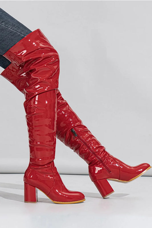 Stivali sopra il ginocchio con cerniera, punta tonda, tacco spesso e patchwork, tinta unita
