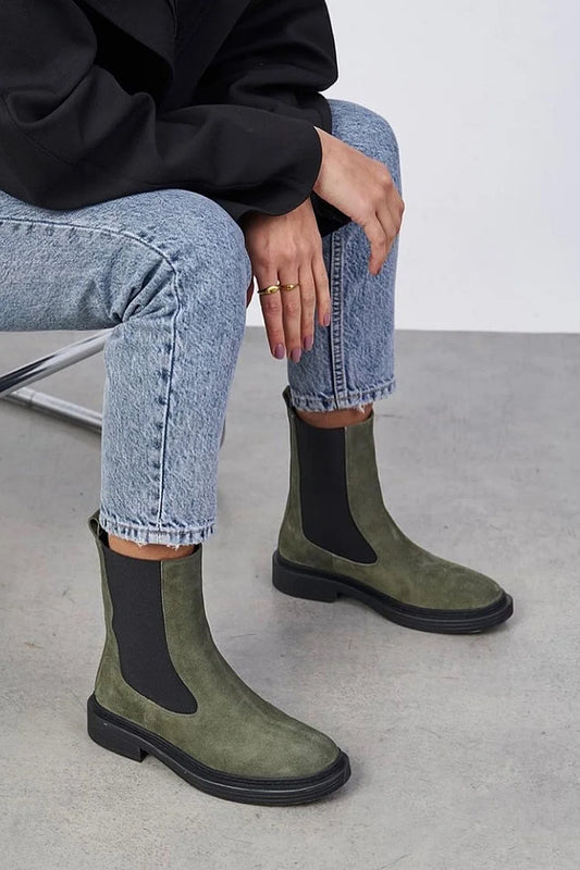 Stivaletti alla caviglia verde scuro con punta tonda e tacco basso a blocco [Pre-ordine]