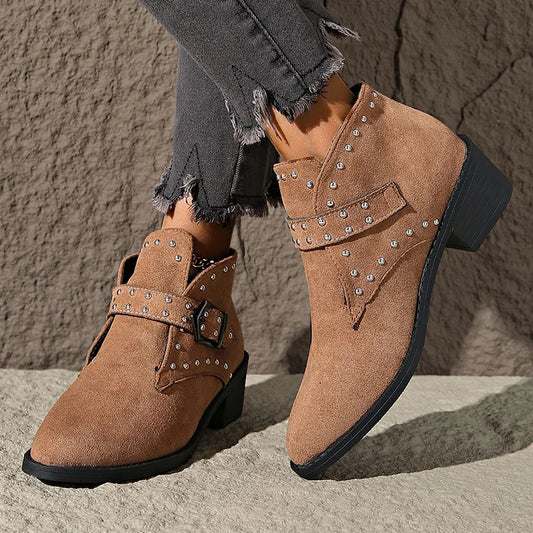 Stivaletti alla caviglia con cinturino con borchie metalliche, fibbia, punta affilata e tacco spesso