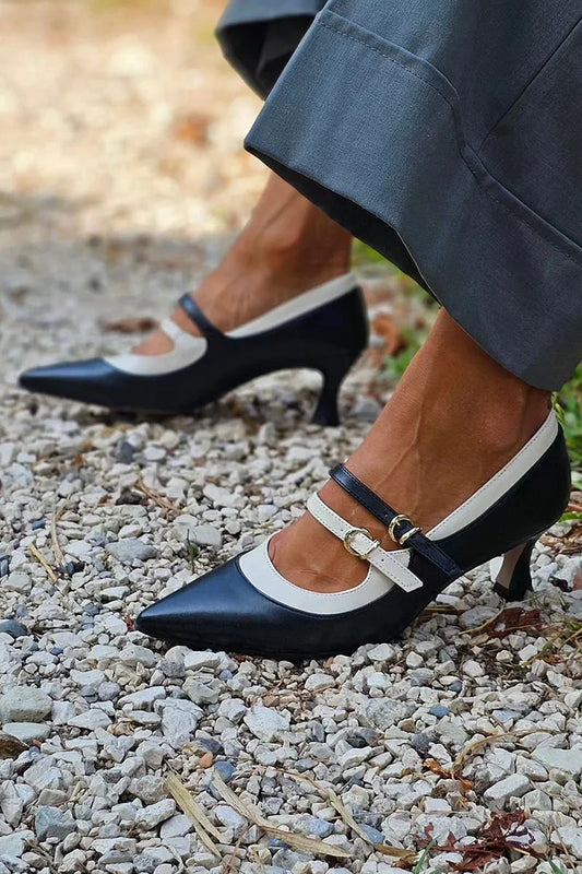 Scarpe con tacco a spillo nere a punta con due cinturini sul collo del piede abbinati al colore [Pre-ordine]