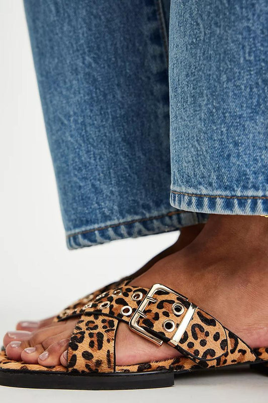 Pantofole con punta quadrata, fibbia e cinturino incrociato con motivo leopardato [Pre-ordine]