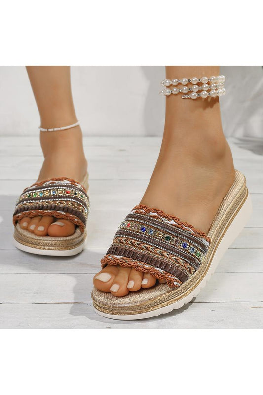 Pantofole casual con zeppa, punta rotonda, cinturino intrecciato e decorazioni in strass