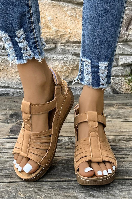 Sandali casual con zeppa, punta tonda e cinturino a T in tinta unita
