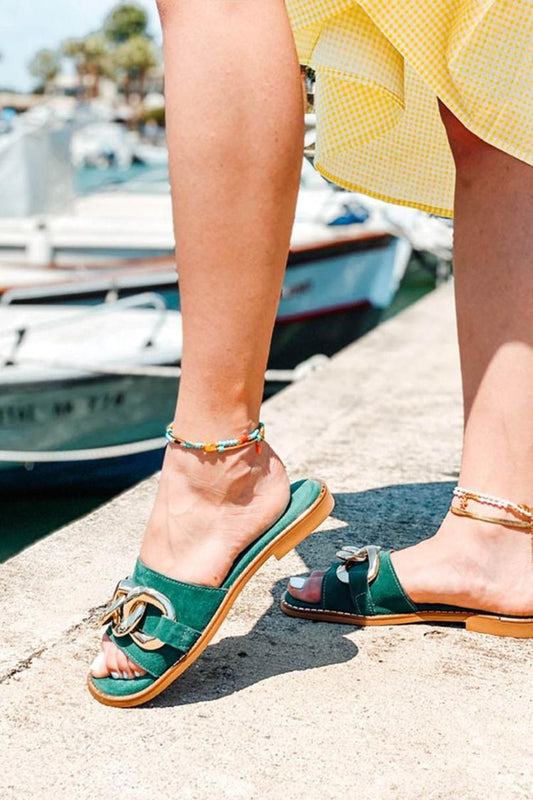 Sandali con punta aperta e decorazioni in catena di metallo verde scuro [Pre-ordine]