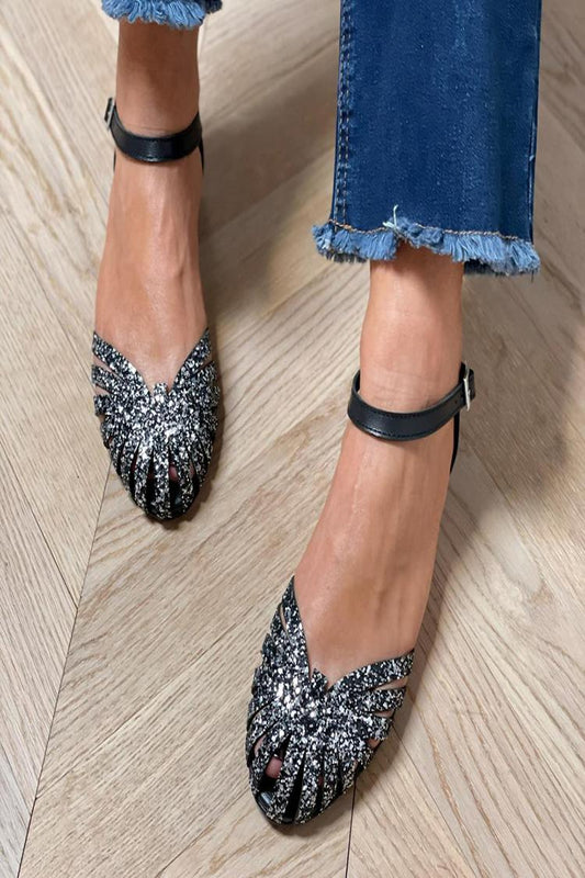 Sandali neri con cinturino alla caviglia, fibbia e punta tonda con glitter e trafori