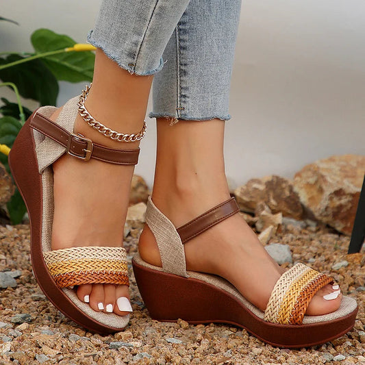 Sandali con zeppa e plateau abbinati, cinturino alla caviglia e punta all'uncinetto