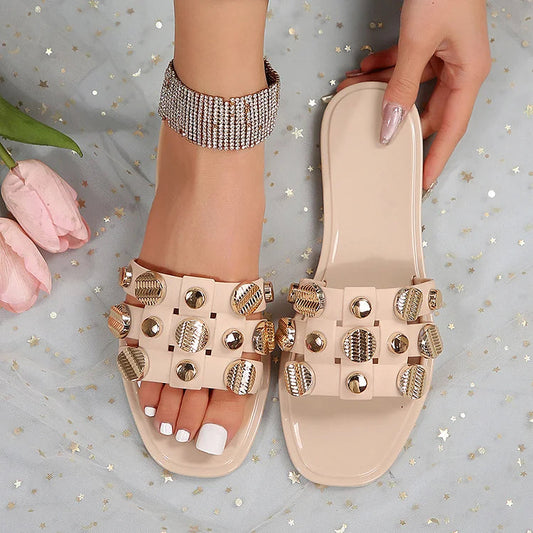 Comode pantofole con punta quadrata, cucitura prismatica, decorazioni borchiate