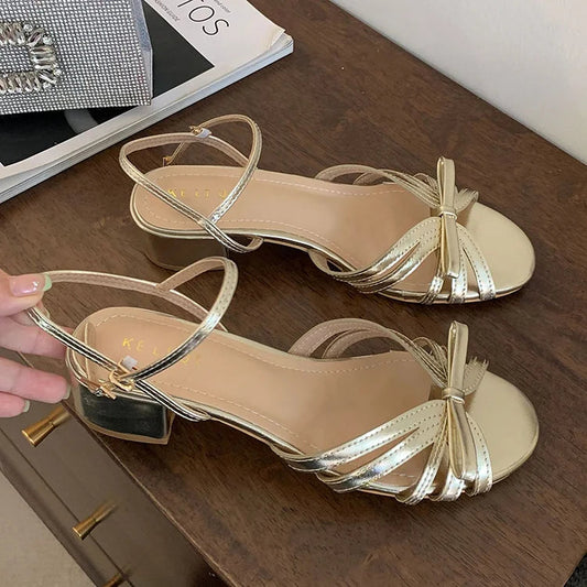 Sandali con cinturino alla caviglia, punta aperta, fibbia e tacco a spillo decorati con fiocco