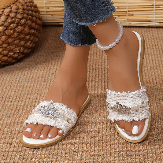 Pantofole chic con punta rotonda e decorazione di perle con corona di strass e finiture sfilacciate