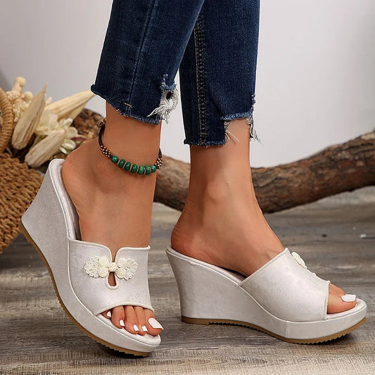 Pantofole semplici con zeppa e plateau a forma di muffin, con stampa floreale e ricami mozzafiato