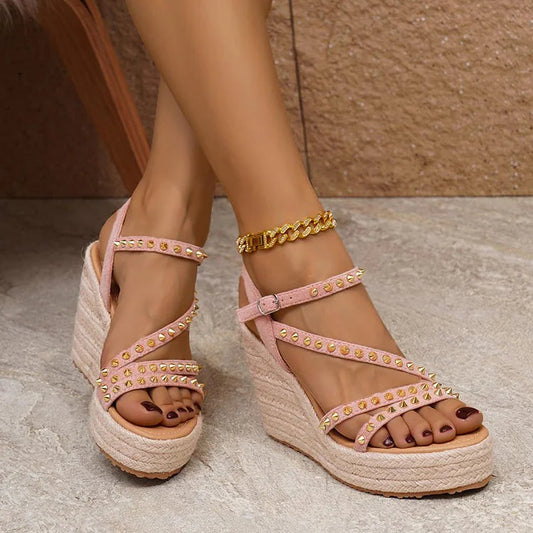 Sandali con zeppa espadrillas con plateau e fibbia con decorazione borchiata