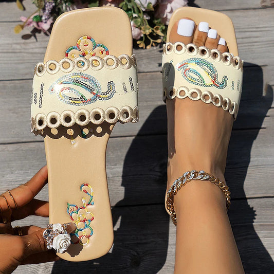 Pantofole con punta quadrata scavata con ricami floreali con paillettes