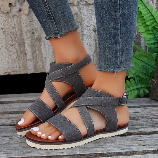 Sandali con punta tonda e fibbia incrociata in tela trapuntata