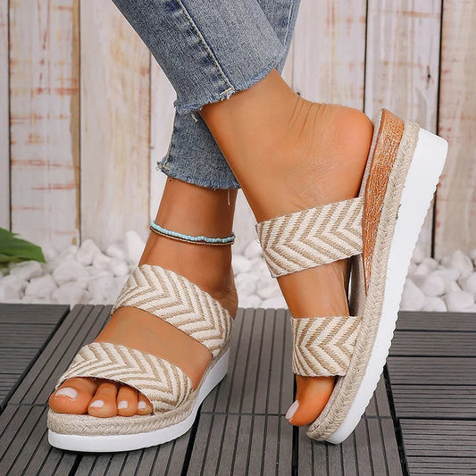 Pantofole espadrillas con zeppa e plateau con motivo intrecciato e cintura con doppio collo del piede