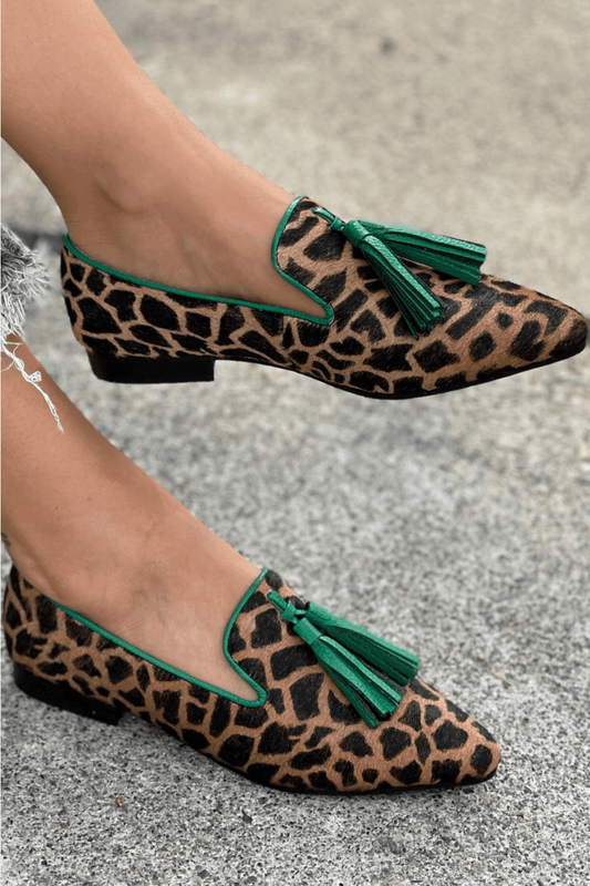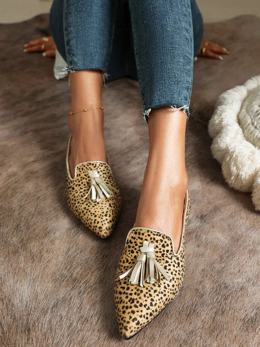 Scarpe basse da donna con punta a punta, slip-on, in similpelle, con decorazioni leopardate e nappe stampate