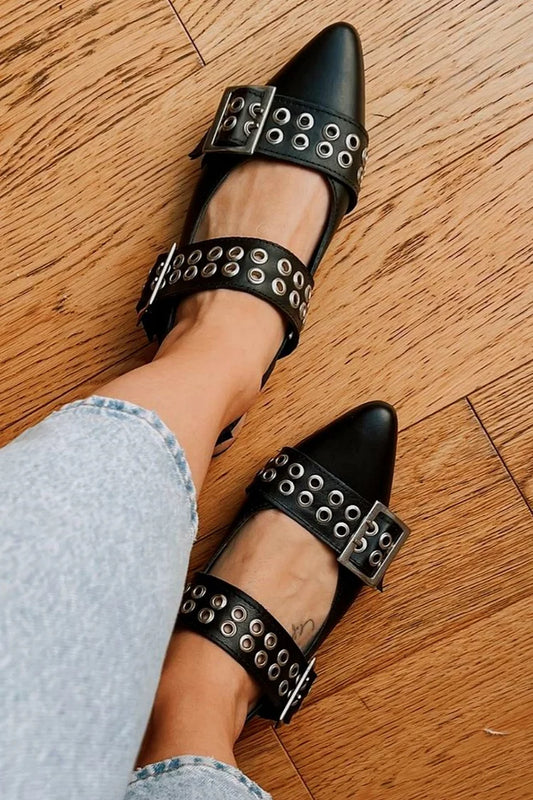 Occhielli metallici Collo del piede Cinturino Fibbia Punta a punta Scarpe basse nere [Preordine]