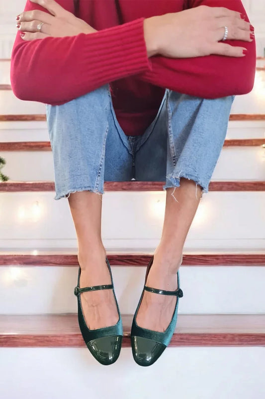 Scarpe basse verde scuro con cinturino sul collo del piede patchwork e fibbia [Pre-ordine]