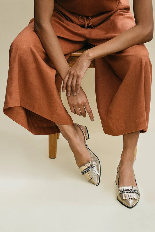 Scarpe basse color champagne con punta a punta, decorazioni con frange e catena in metallo [Pre-ordine]
