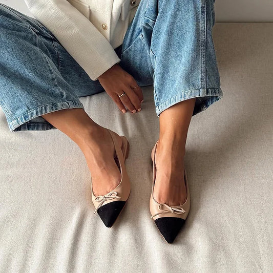 Scarpe basse color cachi con cinturino posteriore, punta affilata e fiocco decorato in patchwork [Pre-ordine]