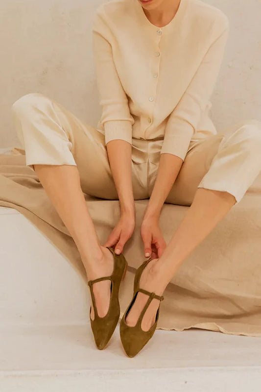 Scarpe basse verde oliva con punta a punta, cinturino a T e fibbia tinta unita [Pre-ordine]