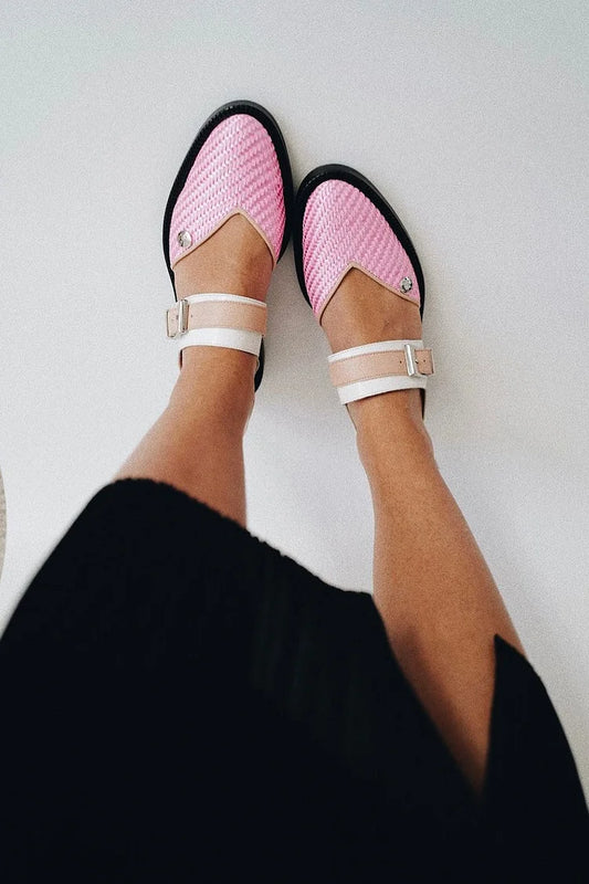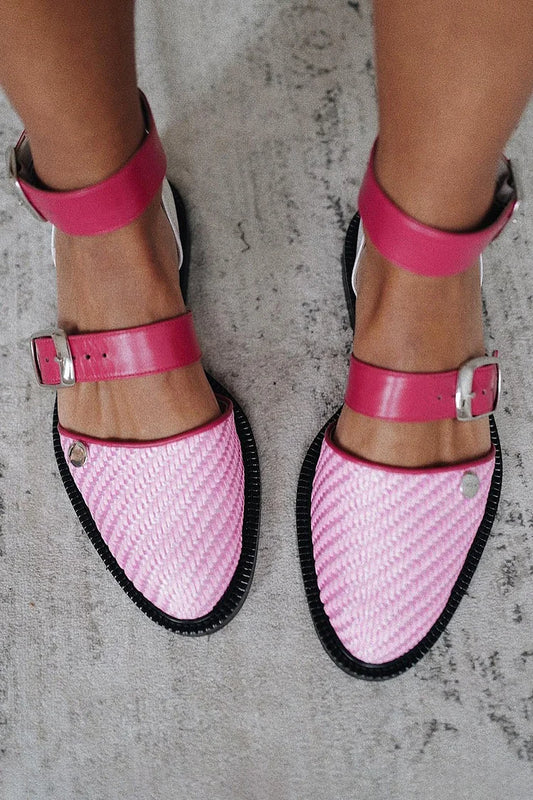 Scarpe basse rosa con punta tonda e fibbie a due cinturini e blocchi di colore [Pre-ordine]