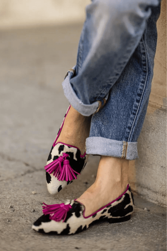 Ballerine rosa con stampa in pelle di mucca e nappe [Pre-ordine]