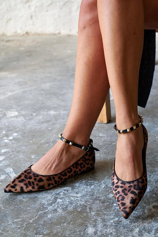 Scarpe basse marroni con punta a punta e stampa leopardata con borchie in metallo [Pre-ordine]