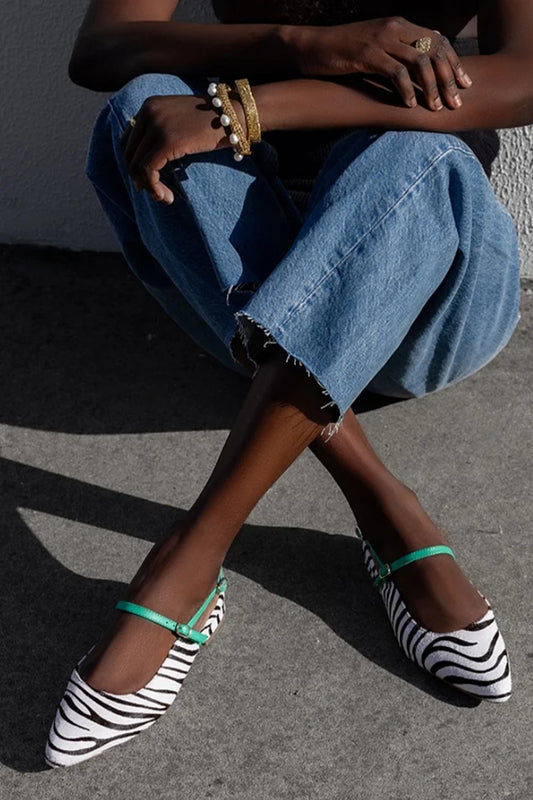 Scarpe basse bianche con punta affilata, fibbia con cinturino colorblock e stampa zebra [Pre-ordine]