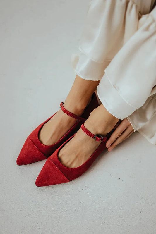 Scarpe basse rosse con punta a punta e due cinturini con fibbie in tinta unita [Pre-ordine]