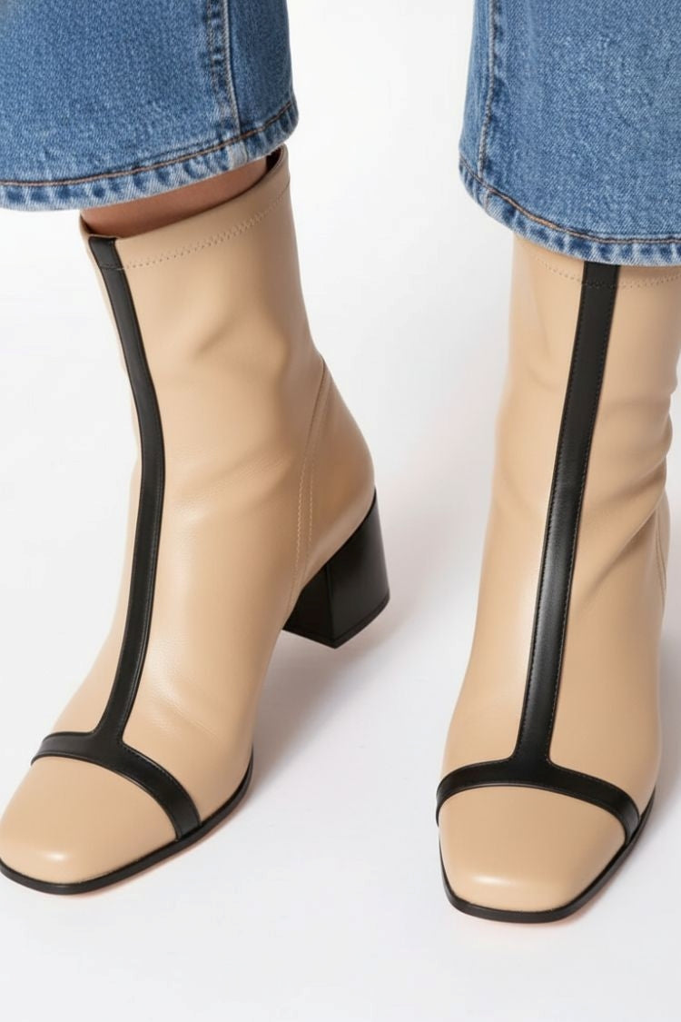 Stivaletti alla caviglia con punta quadrata e tacco spesso in pelle patchwork color albicocca [Pre-ordine]