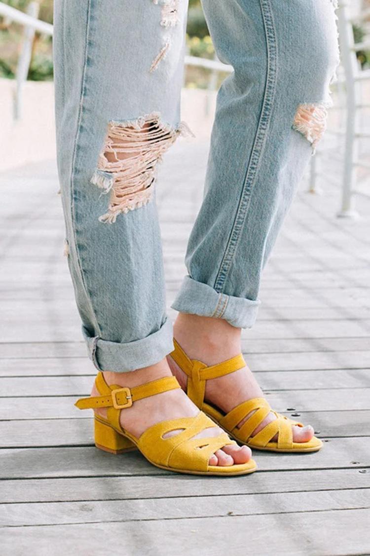 Scarpe con tacco basso gialle a punta aperta e traforata, tinta unita [Pre-ordine]