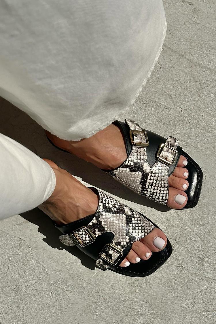 Pantofole nere con punta quadrata, due cinturini e fibbie con stampa serpente [Pre-ordine]
