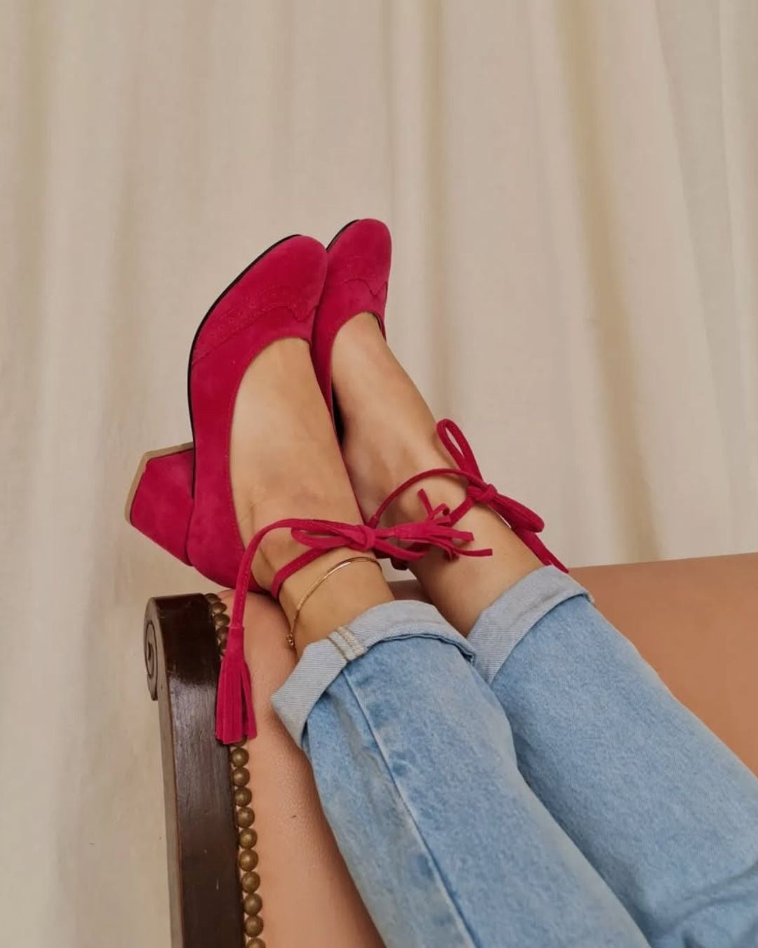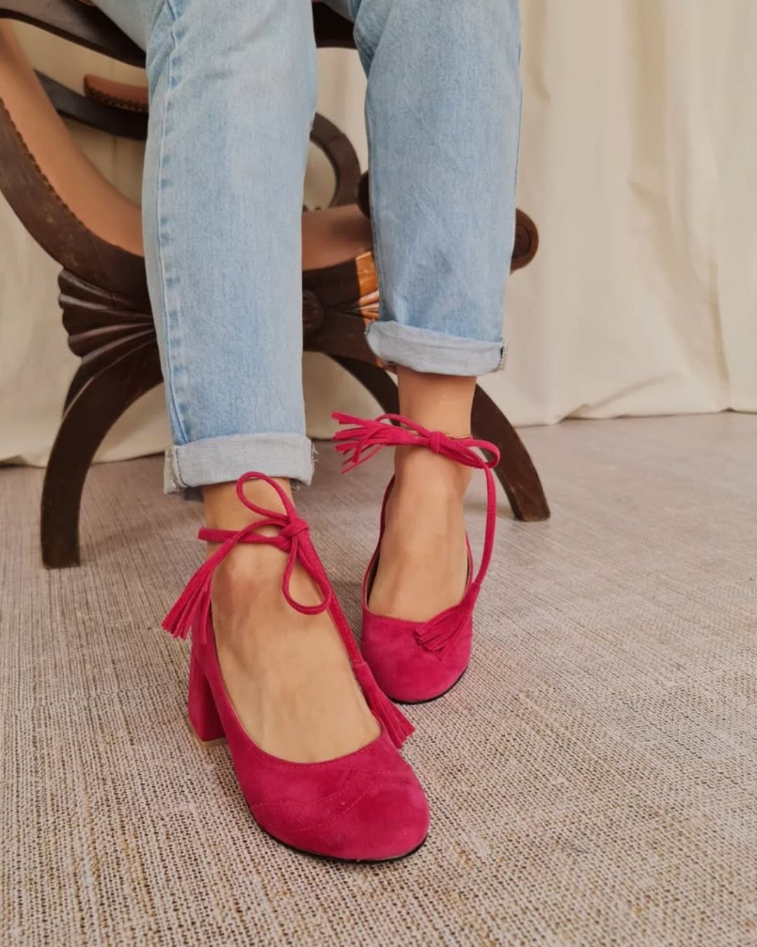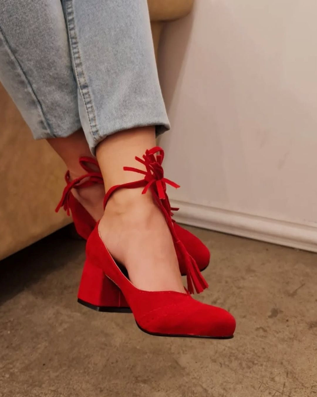 Décolleté con tacco spesso, punta affilata, lacci e frange [Pre-ordine]
