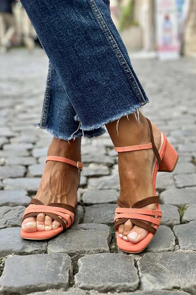 Scarpe con tacco grosso color block, punta quadrata, cinturino alla caviglia, fibbia color corallo [Pre-ordine]