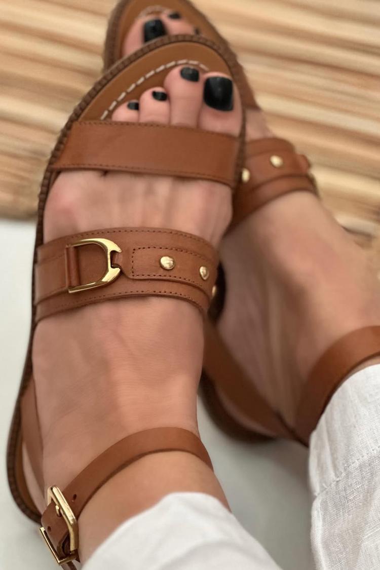 Sandali marroni con punta tonda, fibbia con cinturino alla caviglia e rivetti in metallo [Pre-ordine]