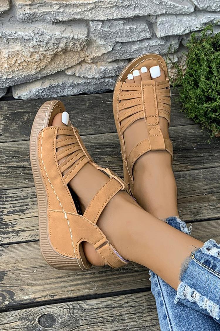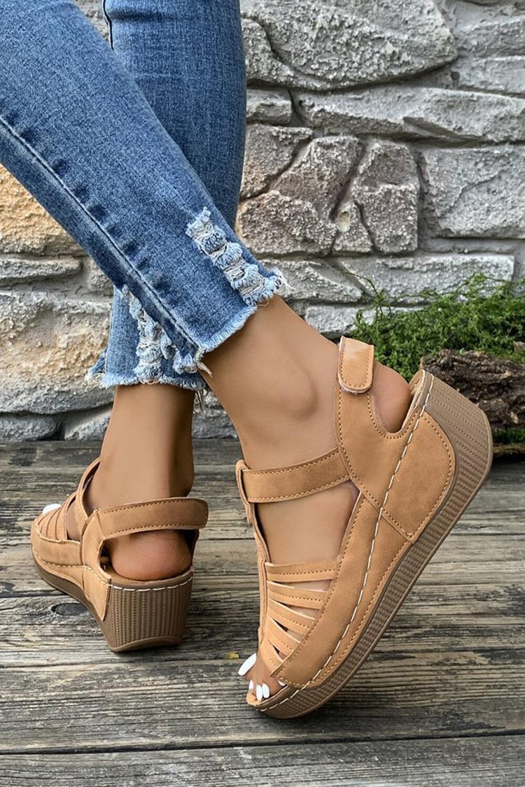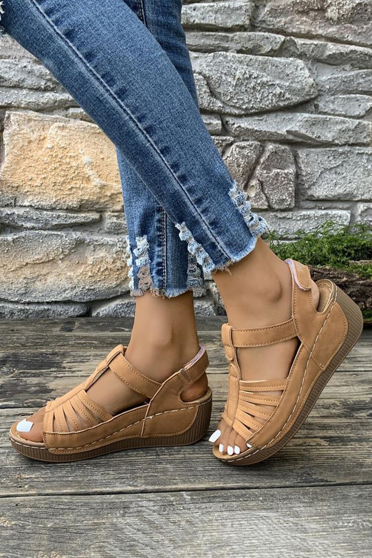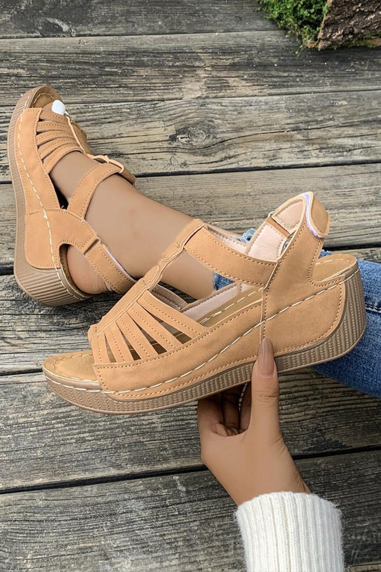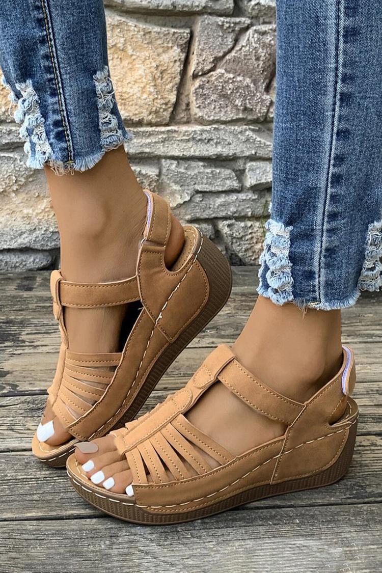 Sandali casual con zeppa, punta tonda e cinturino a T in tinta unita