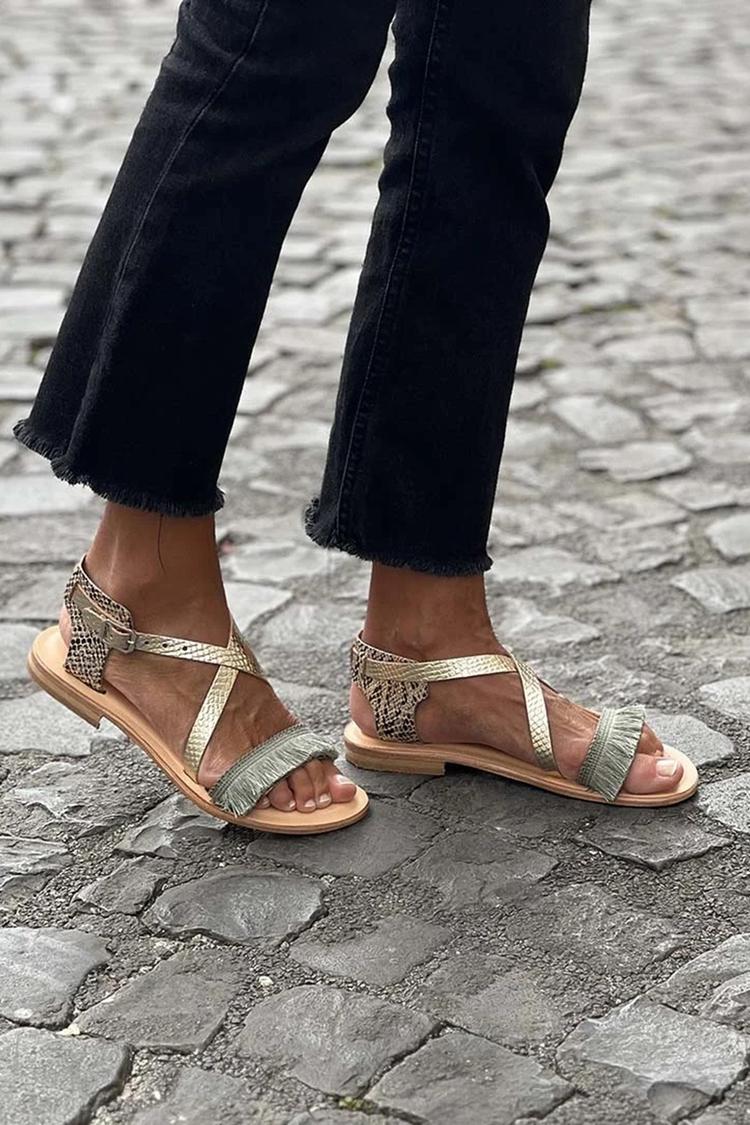 Sandali dorati con punta tonda, fibbia con cinturino incrociato e nappe decorative [Pre-ordine]