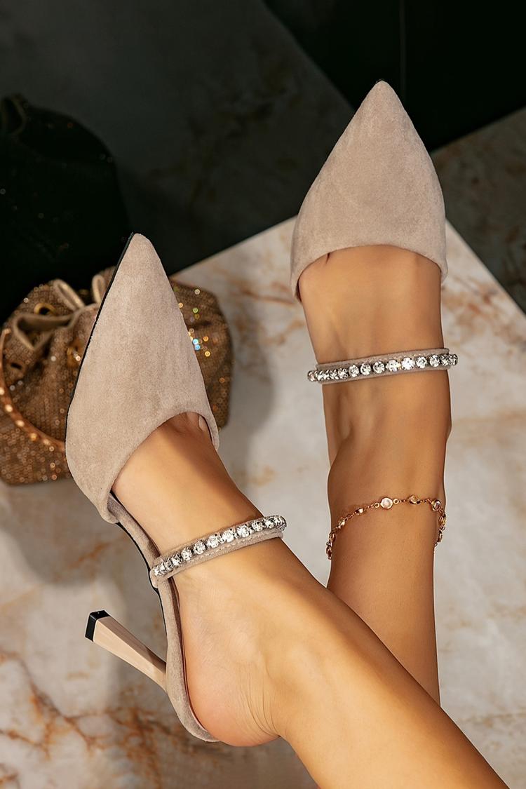 Sandali con tacco a spillo e cinturino sul collo del piede con decorazioni in strass