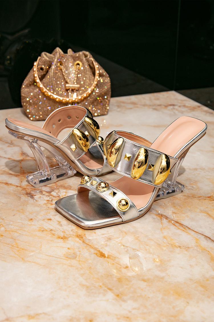 Sandali con tacco a spillo quadrati, decorati con borchie irregolari e lucentezza metallica