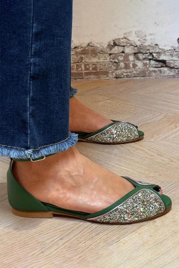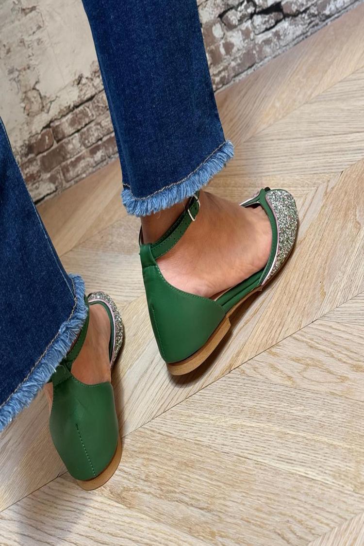 Sandali verdi con cinturino alla caviglia, fibbia e punta aperta e glitter [Pre-ordine]