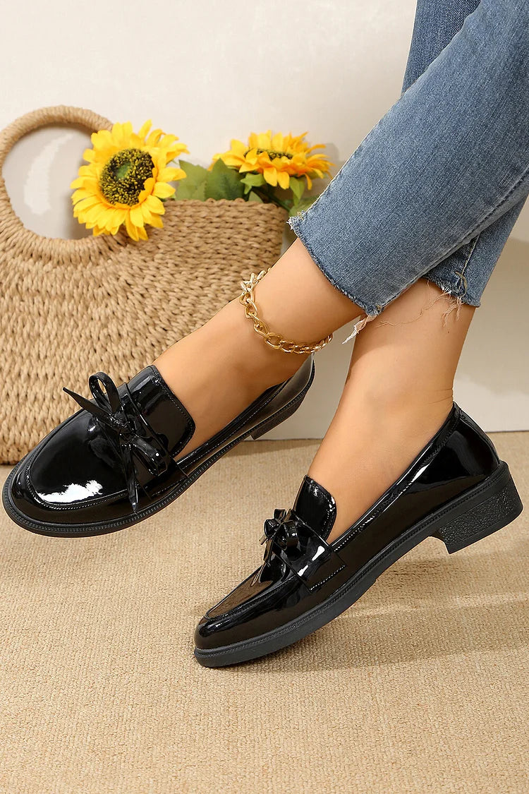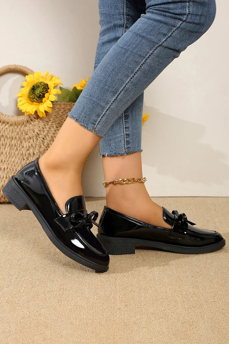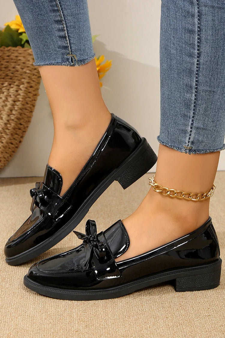 Mocassini con tacco basso e punta tonda, decorati con patchwork in tinta unita e fiocco