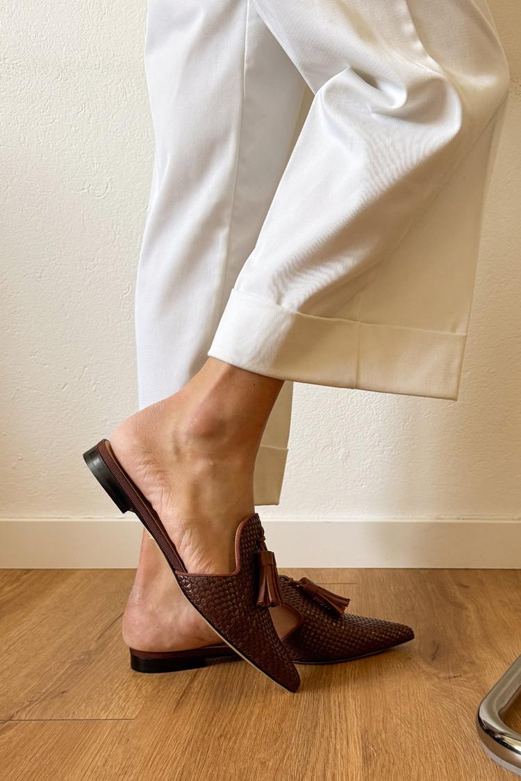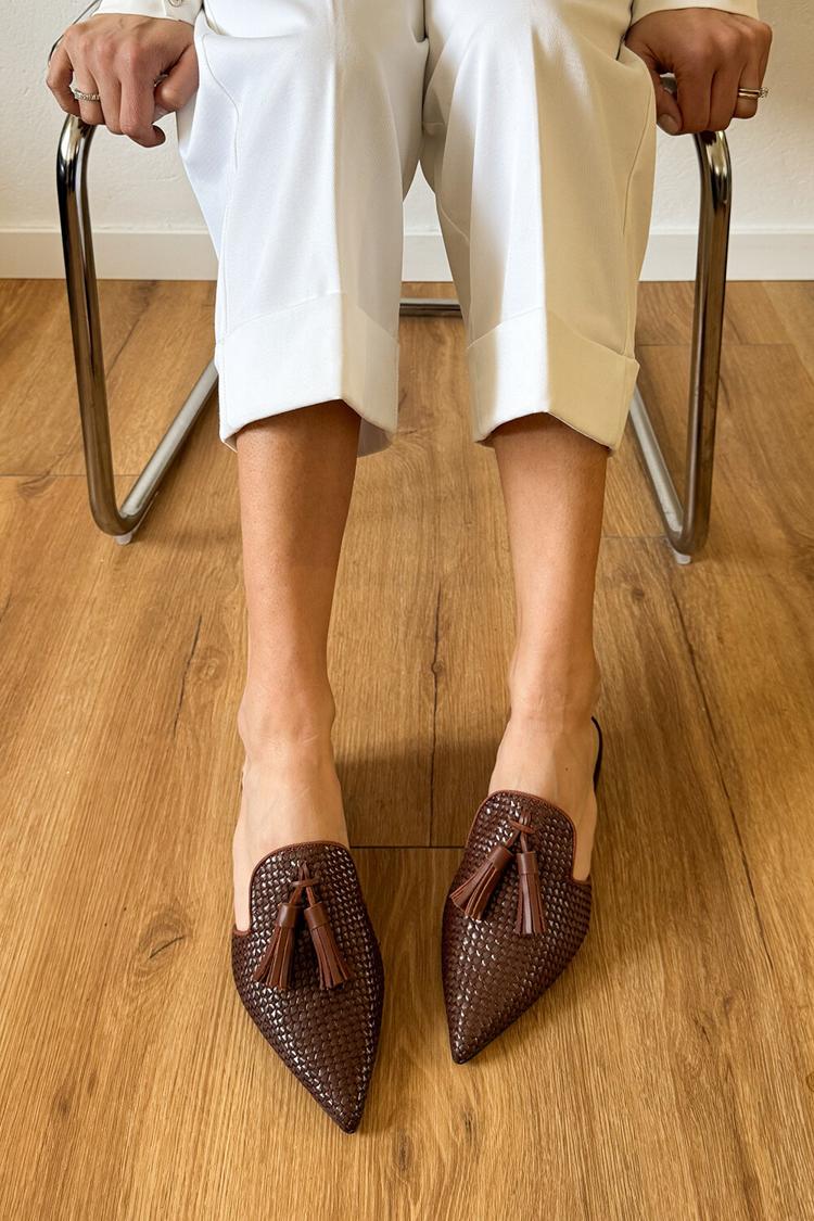 Scarpe basse marrone scuro con punta a punta e decorazioni a nappa, tinta unita [Pre-ordine]