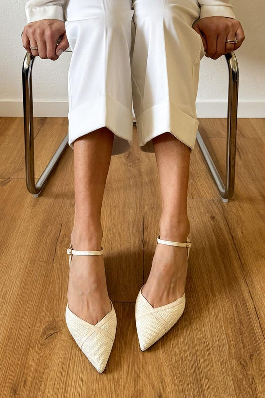 Scarpe basse color avorio con punta affilata, cinturino alla caviglia e fibbia [Pre-ordine]