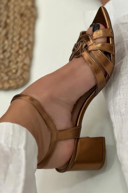 Cinturino alla caviglia, fibbia, punta aperta intrecciata, tacco spesso dorato [Pre-ordine]