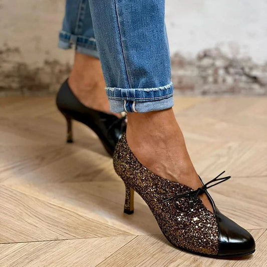 Scarpe con tacco a spillo nere glitterate e punta tonda con lacci patchwork [Pre-ordine]