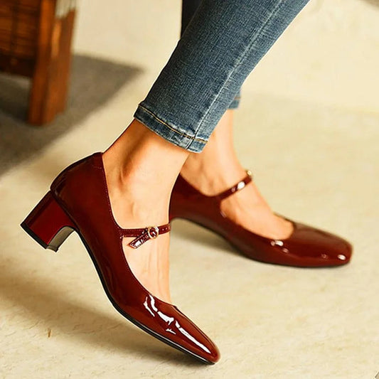 Tacco spesso bordeaux con cinturino alla caviglia e punta tonda patchwork [Pre-ordine]
